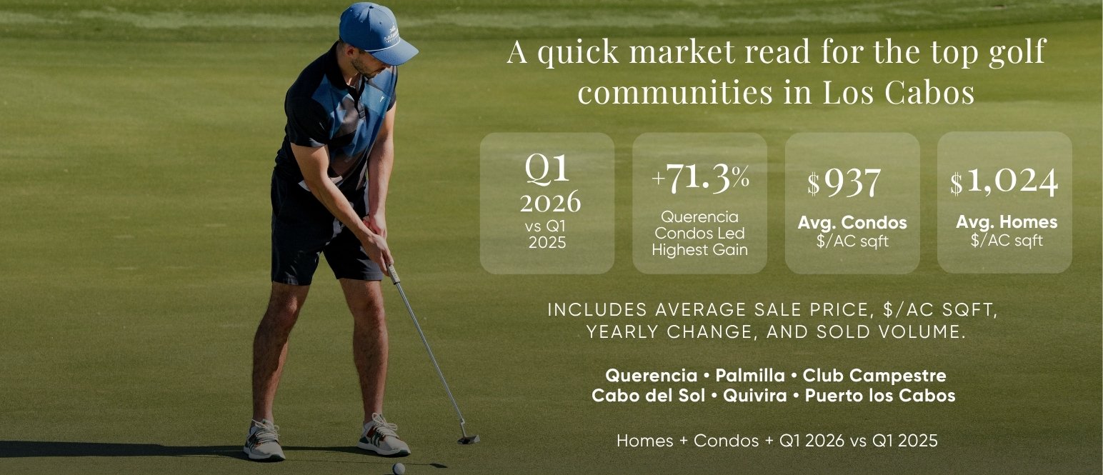 Querencia continued to show strong pricing across both homes and condos in full-year 2025, with homes averaging $5.38M and condos averaging $3.17M. Q1 2026 showed a sharp jump in condo performance and continued premium pricing in the home segment, reinforcing Querencia’s position as one of San José del Cabo’s most established luxury golf communities.